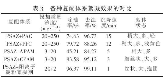 由表2 可知:6 種絮凝劑中,PAC?PFC?APAM?CPAM 對廢水中油的去除效果較差, 而PSAZ 和陽離子淀粉絮凝劑對油的去除效果相對較好?其原因是PSAZ 除了具有單元無機高分子絮凝劑的共同優點外,其異核金屬離子的交錯排列能夠形成更長?更穩定的分子鏈,一方面增加了其聚合度和分枝程度,使網捕作用加強; 另一方面金屬離子的引入增加了所帶的電荷量,使其吸附電中和能力提高,增加了其處理效果?陽離子淀粉絮凝劑的處理效果雖然次于PSAZ,但其沉淀速度是最快的,這就縮短了處理時間,提高了處理效率?各種復配體系絮凝效果的對比如表3 所示?
