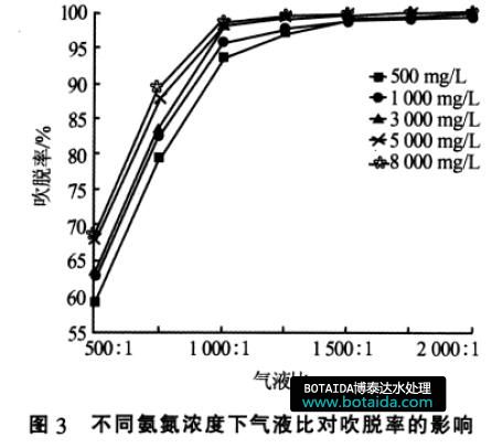 由圖3 可知,氣液比小于1 000∶1 時,不同氨氮濃度廢水的吹脫率均隨氣液比的增加顯著提高;但氣液比達到1 000∶1 時, 氨氮質量濃度≥3 000 mg/L以上的廢水吹脫率可達95%以上; 繼續提高氣液比,吹脫率增加緩慢;而氨氮質量濃度<3 000 mg/L的廢水吹脫率接近95%,繼續提高氣液比至1 500∶1后,吹脫率可達95%以上且增加緩慢。這表明,氣液比超過1 000∶1 后, 進水氨氮濃度對吹脫率影響不大。實驗中為獲得95%以上的吹脫率,應根據進水氨氮濃度將氣液比控制在(1 000~2 000)∶1 的范圍。