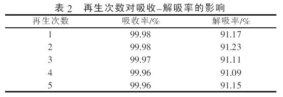 由表2 可知,吸收液經5 次吸收-解吸循環,對氨吸收率均保持在99.9%以上, 解吸率均達91%以上,表明新型吸收液具有良好的可再生性。