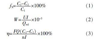 COD:Hach試劑法;氨氮:Hach試劑法;堿度:鹽酸滴定法;硬度:EDTA滴定法;氯離子:硝酸銀滴定法;電導率:電導率儀測量;濁度:濁度計測量;pH:pH計測量;另外需要記錄的裝置運行參數包括流量、壓強、運行電壓、電流等。脫鹽率、耗電量、電流效率分別按照式(1)~式(3)計算。
