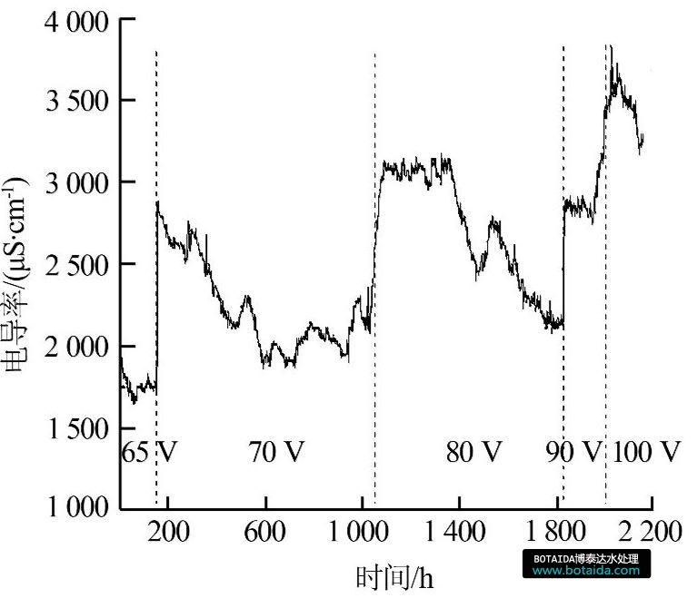 運行電壓隨進水電導率變化趨勢見圖3。