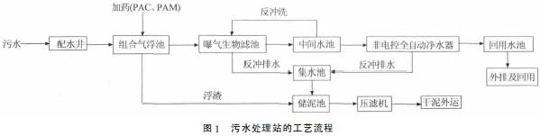 集水井的廢水由提升泵進入斜管沉淀池,池內安裝斜管填料,工藝為升流式異向流斜管沉淀。斜管沉淀池及氣浮池主要進行物化預處理,去除部分COD 和懸浮物。由于物化處理對溶解性污染物去除率相對較低,出水難以達到污水排放標準要求,因此物化預處理后采用生化處理。氣浮池出水進入完全混合式曝氣池與活性污泥混合,在人工充氧條件下,活性污泥吸附并氧化分解廢水中的溶解性有機物,污泥和水的分離則由二次沉淀池完成。最后活性炭復合濾料過濾器對廢水進行深度處理,進一步去除其中的COD 和懸浮物,保證良好的出水水質。