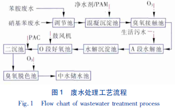 苯胺、硝基苯綜合廢水中含有大量難降解有機物,COD 值較高,可生化性極差(一般B /C 值為0 ~0.1) ,屬于高含鹽廢水,因此綜合考慮多種因素,決定采用物化與生化處理相結合的工藝。以混凝沉淀和臭氧氧化作為預處理單元,不會提高廢水的含鹽量,但可以提高廢水的可生化性,使A/O 生物系統處理效率大幅提高; 在末端再進行臭氧氧化脫色處理可確保出水色度達標。工藝流程見圖1。