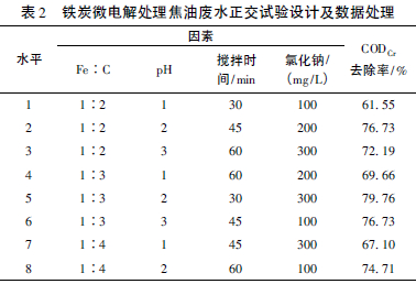 通過正交試驗,得到可以使CODCr去除率最高的最佳條件是: 鐵炭比為1∶3,pH值為2,氯化鈉投加量為200 mg/L,攪拌時間為45 min。在該條件下,焦油廢水的CODCr去除率最高,達到81. 26%。對于廢水的預處理來說,這樣的去除效果較為良好。