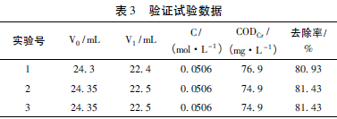 由正交試驗的數據分析已知: 本實驗的最佳條件為Fe∶C =1∶3,NaCl 的投加量為200 mg/L,pH為2,攪拌反應時間為45 min。用該條件處理卷煙廠的焦油廢水,進行三組平行實驗,測定這三個水樣的CODCr值,計算其去除率,從而驗證該條件是否最佳。實驗數據見表3。