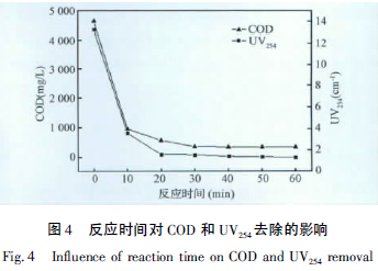 由圖4 可以看到,在反應起始的10 min 之內COD 就降低到1 000 mg /L 以下,UV254變化趨勢也和COD 的變化趨勢一樣,快速降低,COD 和UV254在30 min 分別降低到352 mg /L、1.59 cm-1。可能由于廢水中還含有Cu2+和Ni2+,這兩者與Fe2+發生協同催化作用,提高了催化降解速度。隨著反應時間的進行COD 和UV254變化不大,因此從設備的使用效率和處理速度來講,最佳反應時間可以定為30 min。