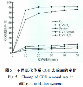 量取300 mL 廢水,調節其pH=4 分別采用O3、UV/O3、Fenton(28 mL H2O2、1.6g FeSO4·7H2O) 、UV-Fenton(28 mL H2O2、1.6g FeSO4·7H2O) UV/H2O2(2 mL H2O2) 氧化體系處理廢水50 min,并分別在0、10、20、30、40 和50 min 取樣,中止反應,測定處理后廢水的COD,其COD 去除率隨時間的變化如圖5 所示。