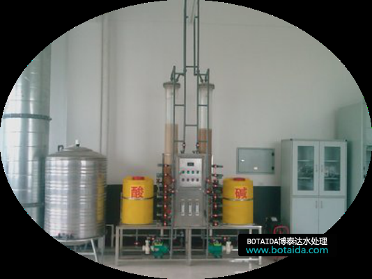 混床是混合離子交換柱的簡稱,是針對離子交換技術所設計的設備。所謂混床,就是把一定比例的陽、陰離子交換樹脂混合裝填于同一交換裝置中,對流體中的離子進行交換、脫除。由于陽樹脂的比重比陰樹脂大,所以在混床內陰樹脂在上陽樹脂在下。一般陽、陰樹脂裝填的比例為1:2,也有裝填比例為1:1.5的,可按不同樹脂酌情考慮選擇。混床也分為體內同步再生式混床和體外再生式混床。同步再生式混床在運行及整個再生過程均在混床內進行,再生時樹脂不移出設備以外,且陽、陰樹脂同時再生,因此所需附屬設備少,操作簡便。