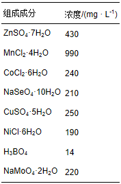 CANON工藝的啟動階段采用人工模擬高氨氮廢水.啟動完成后,利用某石化公司石油裂化催化劑生產廢水對微生物進行馴化,廢水日產量約為15.6×103 m3.模擬高氨氮廢水的水質如表 1所示(于英翠等,2012),微量元素成分見表 2.