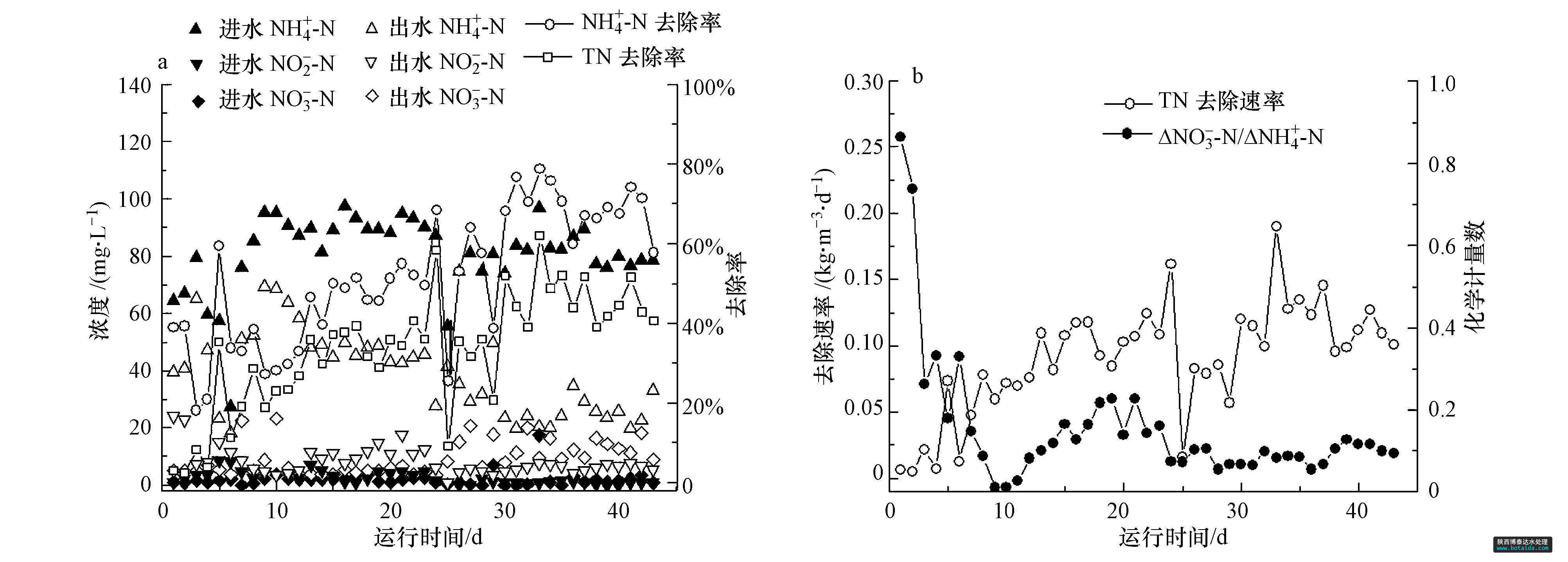 CANON工藝系統中的微生物馴化成功后,考察工藝對于有機物及氮素的去除效果.