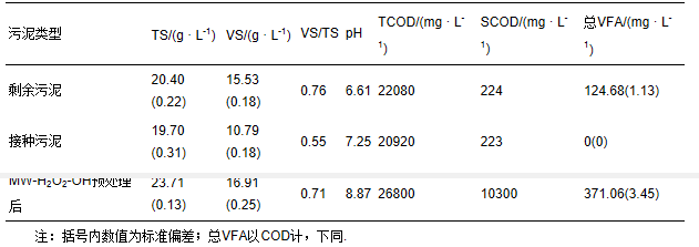 試驗所用剩余污泥取自北京清河污水處理廠,取回后靜置濃縮,置于4 ℃保存.接種污泥取自北京小紅門污水處理廠,為中溫(35℃)厭氧消化出泥.試驗前污泥過18目標準篩以除去大顆粒雜質.試驗采用MW-H2O2-OH預處理工藝(Wang et al., 2015;Wang et al., 2009;Xiao et al., 2012;王亞煒,2009;肖慶聰等,2012;閻鴻,2010),其操作條件如下:加入5 mol · L-1 NaOH溶液,調節樣品pH至11,600 W微波功率輻射樣品,升溫至80 ℃,然后按m(H2O2)/m(TS)=0.2加入30%的過氧化氫溶液,繼續輻射升溫至100℃,結束.本試驗通過微波-過氧化氫-堿預處理達到堿性環境,以抑制產甲烷過程.試驗所用污泥的主要性質見表 2.污泥經過MW-H2O2-OH預處理后,添加100 mg · L-1過氧化氫酶(Sigma),混合完全攪拌一定時間以便將殘留過氧化氫分解完全,之后按照I/S(Inoculum to Substrate,揮發性固體濃度VS/VS)為0.07的比例進行接種污泥接種.之后按照響應面法安排進行試驗,試驗中采用的蛋白酶酶活為20萬U · g-1(江蘇銳陽生物科技有限公司).