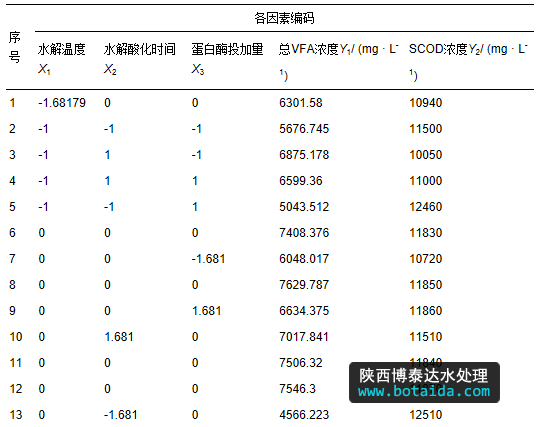 根據CCD(Central Composite Designs)中心組合試驗設計原理,在前期單因素試驗的基礎上,選擇水解溫度、水解酸化時間和蛋白酶投加量作為自變量,分別用X1、X2、X3表示,以總VFA濃度和SCOD濃度作為響應值,分別用Y1、Y2表示,進行響應面試驗因素水平安排,具體見表 1.由Design Expert 8.0.6(Stat-Ease),采用CCD試驗設計原理,得到3因素3水平共20個試驗點的試驗方案,并對試驗數據進行二次多元回歸擬合.二次多元回歸方程為: