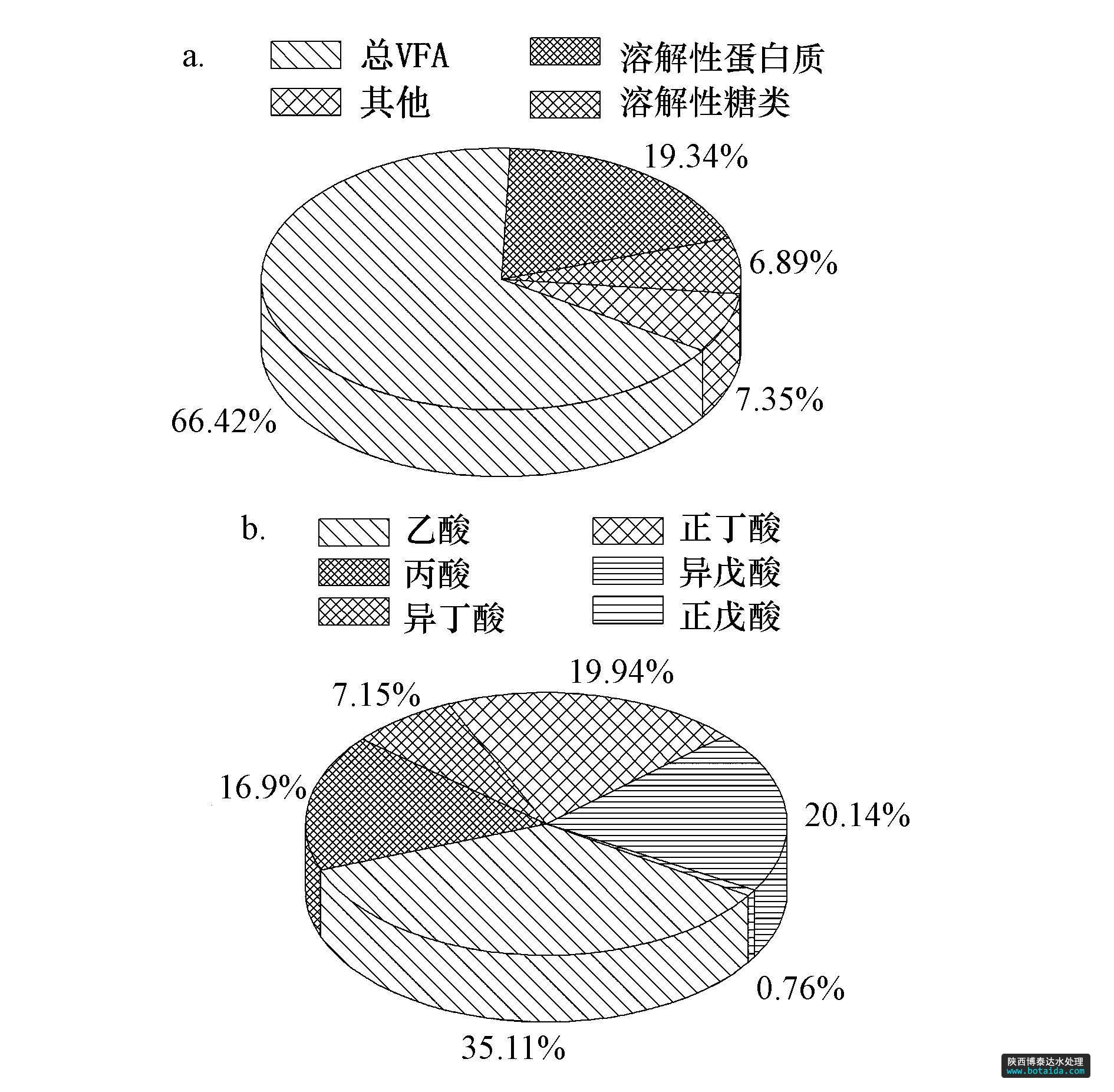 如圖 3所示,在碳源組成方面,優化工藝條件下SCOD占TCOD的44.56%,總VFA占SCOD的66.42%,溶解性蛋白質占SCOD的19.34%,溶解性糖類占SCOD的6.89%,其他類物質占SCOD的7.35%.在VFA組成方面,乙酸占總VFA的35.11%,丙酸占總VFA的16.90%,異丁酸占總VFA的7.15%,正丁酸占總VFA的19.94%,異戊酸占總VFA的20.14%,正戊酸占總VFA的0.76%.碳源以總VFA為主,其中,VFA以乙酸、異戊酸、正丁酸、丙酸為主.