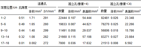 表3 巢湖W1點不同深度沉積物孔隙群統計表(3.375 mm3,250×250×250像素)