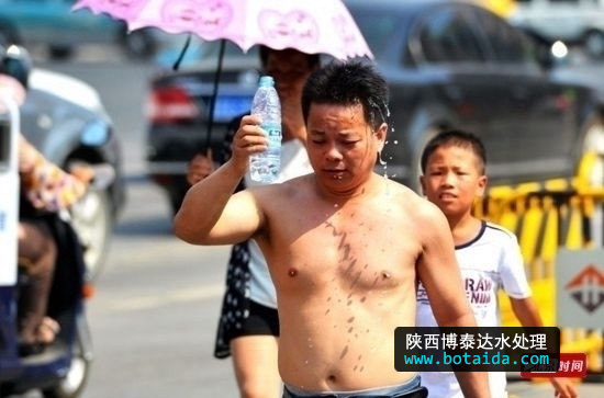 2014年7月22日,實拍濟南40℃高溫市民百態 礦泉水澆頭王府池子游泳 圖為濟南市民街頭用礦泉水澆頭解暑。