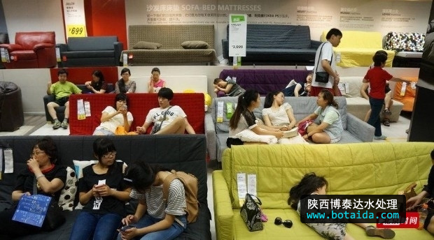 2013年07月28日,北京,當天北京再次迎來一個35度以上的高溫天氣,為了躲避酷暑很多老百姓選擇了到有空調的大型商場去購物,餐飲和避暑。宜家家居客廳區沙發成了搶手貨。