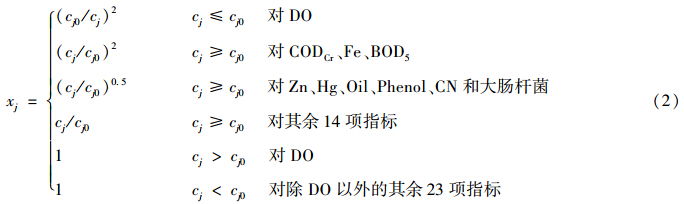 式中,x′j 為指標j的規范值;xj為指標j的變換值,對4類水體和空氣指標j設定的變換式分別如式(2)~式(7)所示.
