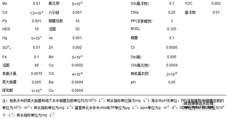 依照國家制訂的地表水環境質量標準(GB3838— 2002)、地下水環境質量標準(GB/14848—1993)、海水環境質量標準(GB3097—1997)、適用于我國湖庫水體的富營養化標準及室外空氣環境質量標準(GB3095—1996)和室內空氣質量標準(GB/T18883—2002),分別選取了4類水體的95項指標(其中,地表水、地下水、海水和富營養化水體分別有24項、33項、23項和15項指標)和空氣的29項指標(其中,室內空氣15項指標和室外空氣7項指標的年、日2種不同分級標準情形)作為水環境和空氣環境的評價指標體系.