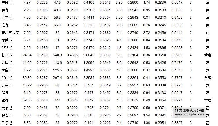 表 9 長江中下游45個湖泊富營養化指標監測數據cj及其規范值 x′j和引力指數公式評價結果