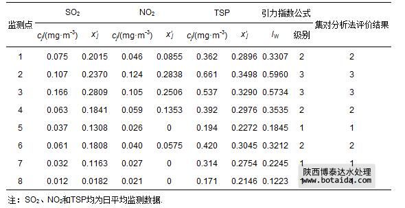 武漢市不同測點的空氣指標日平均濃度監測數據cj(郭紹英等,2009),以及由式(1)和式(6)計算出的指標規范值x′j如表 10所示.在視各指標為等權的情況下,將表 10中的3項指標規范值x′j分別代入式(11)和式(12)所示的引力指數公式,計算得到武漢市各測點空氣質量引力綜合指數值,并根據表 3中空氣環境質量綜合指數值分級標準作出的判斷結果(表 10).表中還列出了參考文獻(郭紹英等,2009)中用集對分析法作出的評價結果.可以看出,引力指數公式評價結果與集對分析評價結果完全一致.