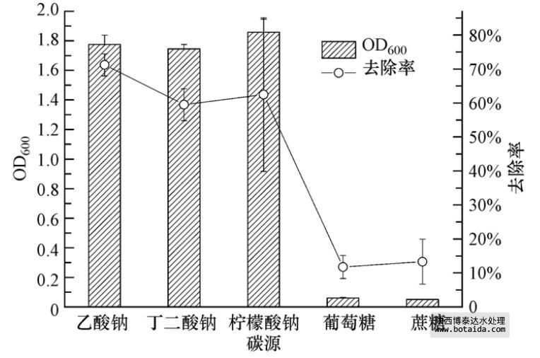 以乙酸鈉、丁二酸鈉、檸檬酸鈉、葡萄糖和蔗糖為碳源,菌株ED-12的生長及除磷能力結果如圖 3所示,菌株ED-12在以葡萄糖和蔗糖為碳源時基本不生長,對PO3-4-P的去除率低于15%. 而菌株在以乙酸鈉、丁二酸鈉、檸檬酸鈉為碳源時長勢較好,且對PO3-4-P的去除率都在50%以上. 其中,以乙酸鈉為碳源時,菌株ED-12生長最旺盛,對PO3-4-P的去除率達到了70%以上. 對比5種碳源結構與分子量,相對而言,在分子結構簡單、分子量低的情況下,聚磷菌的生長較好,且能達到一個較高的除磷率,這與前述觀點相符. 此外,聚磷菌對不同碳源的利用效果可能還與其本身對碳源的親和性或其他特性有關.