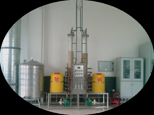 混床外殼制作材質有玻璃鋼、有機玻璃、不銹鋼、碳鋼、防腐等,外型為圓柱型,直徑Φ200—2500mm,產水量從0.5t/h—98t/h。陽床裝載強酸陽離子交換樹脂,陰床裝載強堿陰離子交換樹脂,裝載高度一向在1000—2400 mm,小型濾帽式設備底部沒有承托層,中大型設備底部有粒度不同多級別石英砂承托層(現不建議這樣做,因為酸洗的時候石英砂和酸會產生化學反應,對水質造成影響),逆流再生固定床樹脂頂層有200 mm厚壓脂層樹脂(特殊的樹脂用來覆蓋下面的樹脂)。有機玻璃柱運行壓力≤0.15MPa,其他材質的設備運行壓力≤0.6MPa。陽床配備有酸箱、酸泵再生系統,陰床配備有堿箱、堿泵再生系統。