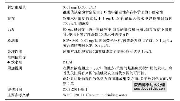 根據人群接觸高濃度鈾的新的流行病學研究推導的30μg /L的暫定準則值,代替原先 根據實驗動物研究推導的暫定準則值。被認定為是基于有關鈾的毒理學和流行病學上的不 確定性以及要實現更低濃度供應在技術上的困難度。要注意的是,有關人類群體的研究如 可獲取且質優,則為用于推導健康準則值相關信息的首選來源