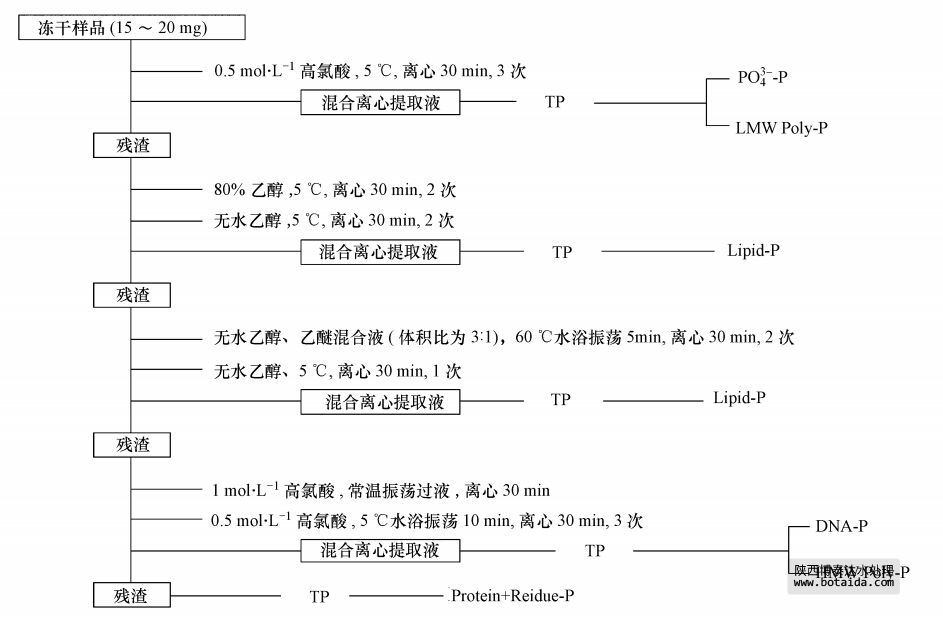 污泥和細菌細胞中不同形態磷含量的測定采用改進的STS法,具體測量步驟見圖 1.該法將樣品中的磷分為正磷酸鹽(PO3-4-P)、低分子量聚磷酸鹽(LMW Poly-P)、磷脂(Lipid-P)、DNA磷(DNA-P)、高分子量聚磷酸鹽(HMW Poly-P)、蛋白質磷和殘渣磷(Protein+Residue-P).混合離心提取液中TP含量測定時采用封閉回流消解法預處理,用鉬銻抗法測定TP和PO3-4-P含量,DNA-P含量由DNA含量乘以系數9.2%計算得到(磷是DNA的特征元素,含量相對恒定),差減計算得到LMW Poly-P和HMW Poly-P含量.