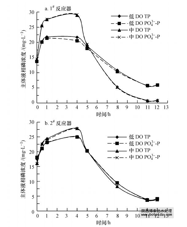 由圖 2可以看出,不同SRT和DO條件下反應器主體液相磷濃度的變化均表現為厭氧升高、好氧降低,說明兩組A/O-SBR系統具有良好的生物強化除磷(EBPR)性能,聚磷菌(PAOs)獲得生長競爭優勢.反應器進水磷源為KH2PO4,反應過程中液相的PO3-4-P濃度占TP濃度的95%以上,說明污泥絮體厭氧釋放和好氧吸收的磷主要為PO3-4-P.