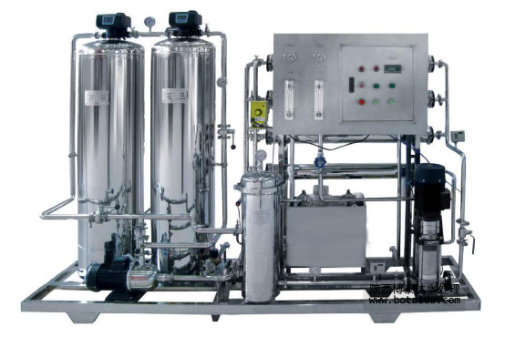 此工藝原理:原水經過精細過濾器、顆粒活性碳過濾器、活性碳過濾器等,再通過泵加壓,利用孔徑為1/10000μm的反滲透膜(RO膜),使較高濃度的水變為低濃度水,同時將重金屬、細菌、病菌等大量混入水中的雜質全部去除,從而達到飲用規定的理化指標及衛生標準。