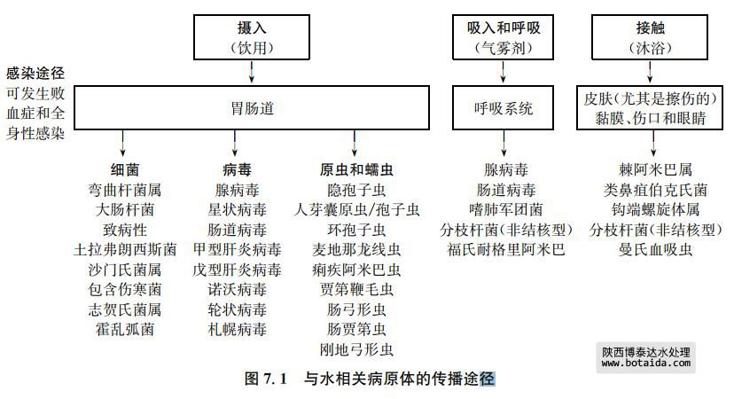 能在自然環境中存在的其他病原體可能導致那些易感人群引發疾病,如老人或幼兒、燒 傷或有大面積創傷的病人、接受免疫抑制療法或是獲得性免疫缺陷綜合癥(艾滋病)患者。 如果這些人飲用或沐浴的水中含有足夠數量的這種病原體,就可引起各種皮膚和眼、耳、鼻、 喉黏膜感染。這些病原包括銅綠假單胞菌、黃桿菌屬、不動桿菌、克雷伯氏菌、沙門氏菌、氣 單胞菌和某些“生長緩慢”的非結核性分枝桿菌等(見附錄1支持文件《水中的病原分枝桿 菌》)。表7.2列出了一些這種生物體(更多詳細內容請參見第11章)。