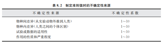 涉及一般人群的接觸劑量時,以動物實驗臨界效應得出的犖犗犃犈犔或犅犕犇/犅犕犇犔通 常要除以不確定性系數100。這里還有兩個10倍系數,其一是物種間差異,另一個是人群中 個體間差異(見表8.2)。另外的不確定性系數還可能來自數據資料的不足和有害作用的嚴 重性和不可逆性。