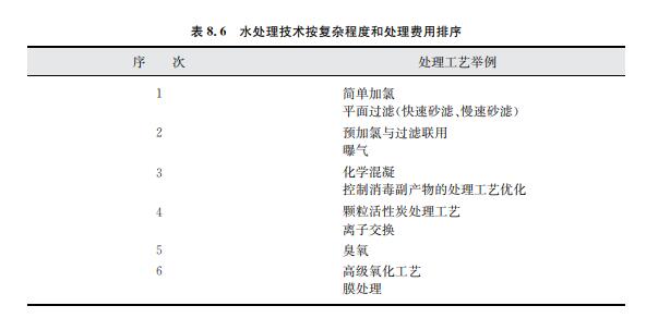 不同水處理工藝按其復雜程度和處理費用的定性排序如表8.6所示,次序越高,工藝或 運營越復雜。同時,通常來說也意味著更高的處理費用。