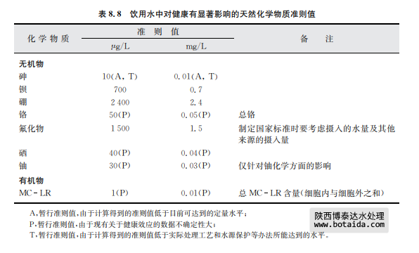 處理天然化學物質的方法隨化學物質的性質和來源不同而不同。對于主要來自巖石和 沉積物的無機污染物,重要的是水源的選擇,需確定水源是否適用或經過處理是否可同時消 除微生物污染和去除水中的特定污染物。在某些情況下,當有多個備選水源時,可將污染物 濃度較低的水用于稀釋或混合含污染物濃度較高的水來達到期望的結果。