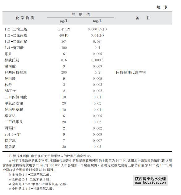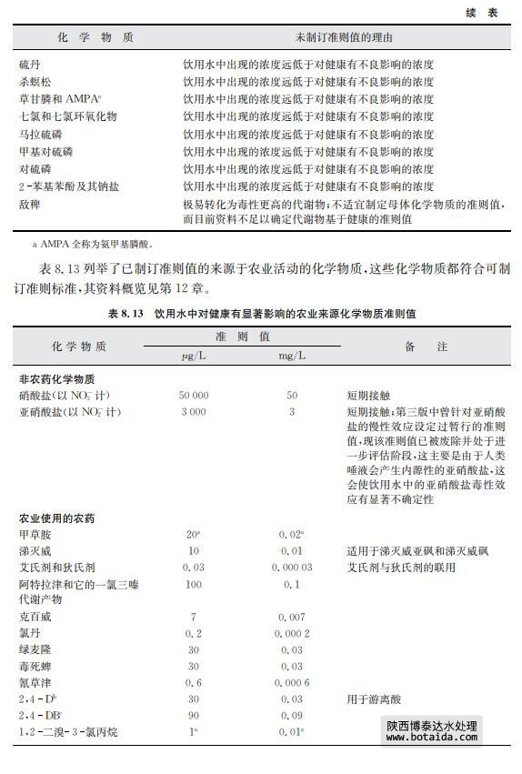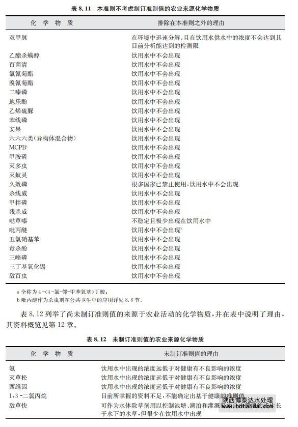 由于一些關于飲用水中存在化學物質以及其穩定性的文獻有明顯證據指出某些農業 來源的化學物質不會出現在飲用水中,對于此類化學物質本準則不考慮建立準則值(見表 8.11)。