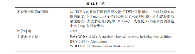 盡管鋁廣泛存在于食物、飲用水及抗酸劑中,很少有跡象表明經口攝入鋁會引起人急性 中毒。有一種假設認為鋁的攝入會增加人類老年癡呆癥發病風險。1997年 WHO發布的 環境健康標準中對鋁作出規定(見表12.5)。