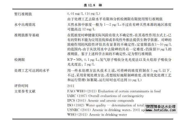 砷的實際定量極限是1~10μg/L,并且在許多情況下去除砷到達10μg/L以下的水平 非常困難。由于實際飲用水工藝中(尤其供水規模較小情況下)去除砷十分困難,以及定量 的檢測限水平較高,將10μg/L保留作為濃度控制目標和暫行準則值。