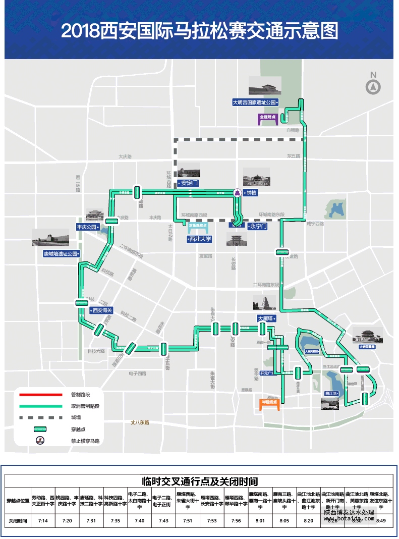 此次西安國際馬拉松的3項比賽起點均設在永寧門,為配合大賽舉辦,根據組委會要求,比賽當日地鐵二號線永寧門站將延遲至上午10點開站,自地鐵運營開始至10時,列車在永寧門站不停站通過,前往永寧門站的乘客可從相鄰的鐘樓站或南稍門站進出車站,由此給廣大乘客出行帶來的不便,請大家給予理解與支持。