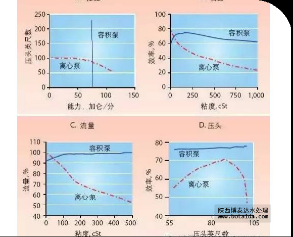總的來說,在粘度超過150 cP時,必須能夠在較廣范圍內預測流量,或者在希望泵機能夠自行起動灌注時,可以考慮選用容積泵。在離心泵與容積泵之間進行選擇時,還要考慮到能耗問題,因為這兩種泵在能耗方面可能會存在著相當大的差別。這一點對于流量低于100加侖/分的情況是特別重要的,在這種情況下,離心泵工作效率的下降幅度會更大。