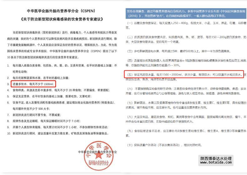 中國營養學會、中華醫學會、地方衛健委等機構發布的“防治新冠病毒感染的飲食指南”中,也多次提到要保證每天1500ml~2000ml的飲水量,多次少量,有效飲水。