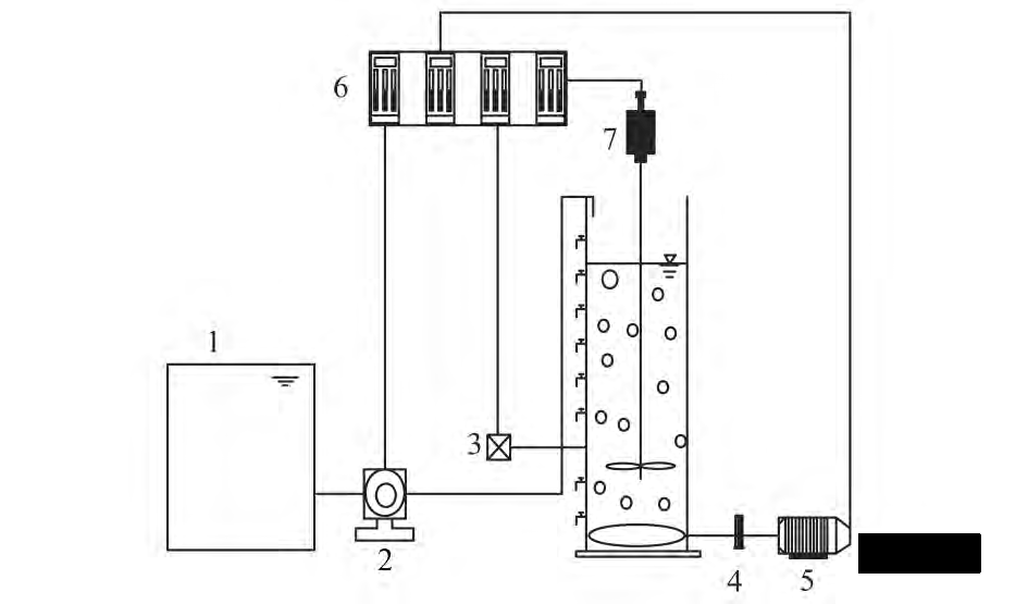 1. 進水箱; 2. 蠕動泵; 3. 出水; 4. 氣體流量計; 5. 鼓風機 6. 進水、出水、攪拌、曝氣時序控制器; 7. 攪拌機
