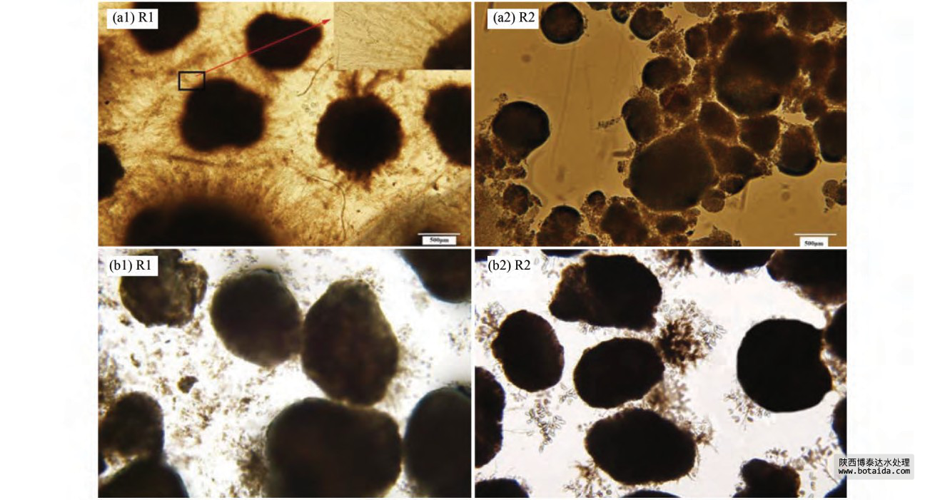 ( a1) R1 和( a2) R2 為 70 d 的顯微鏡照片,( b1) R1 和( b2) R2 為 130 d 的顯微鏡照片圖 3 R1 和 R2 反應器中顆粒污泥的顯微鏡照片