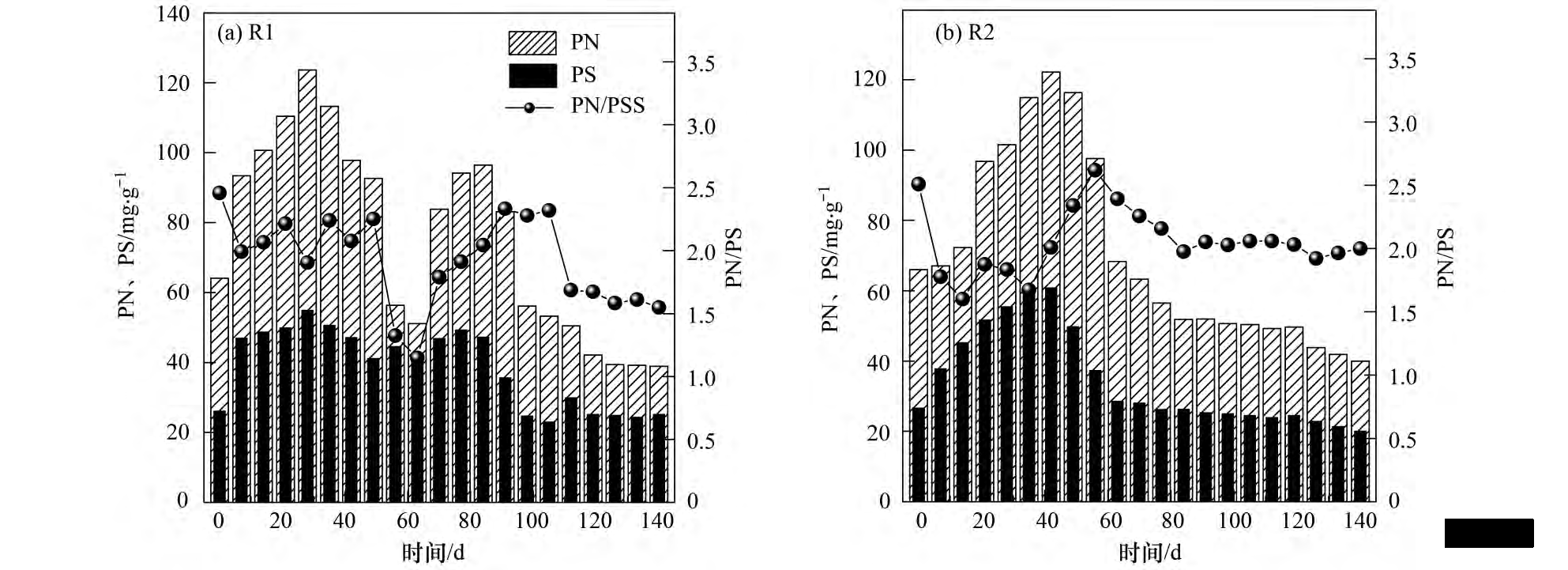 圖 4 R1 和 R2 反應器中 PN、PS 和 PN / PS 值的變化