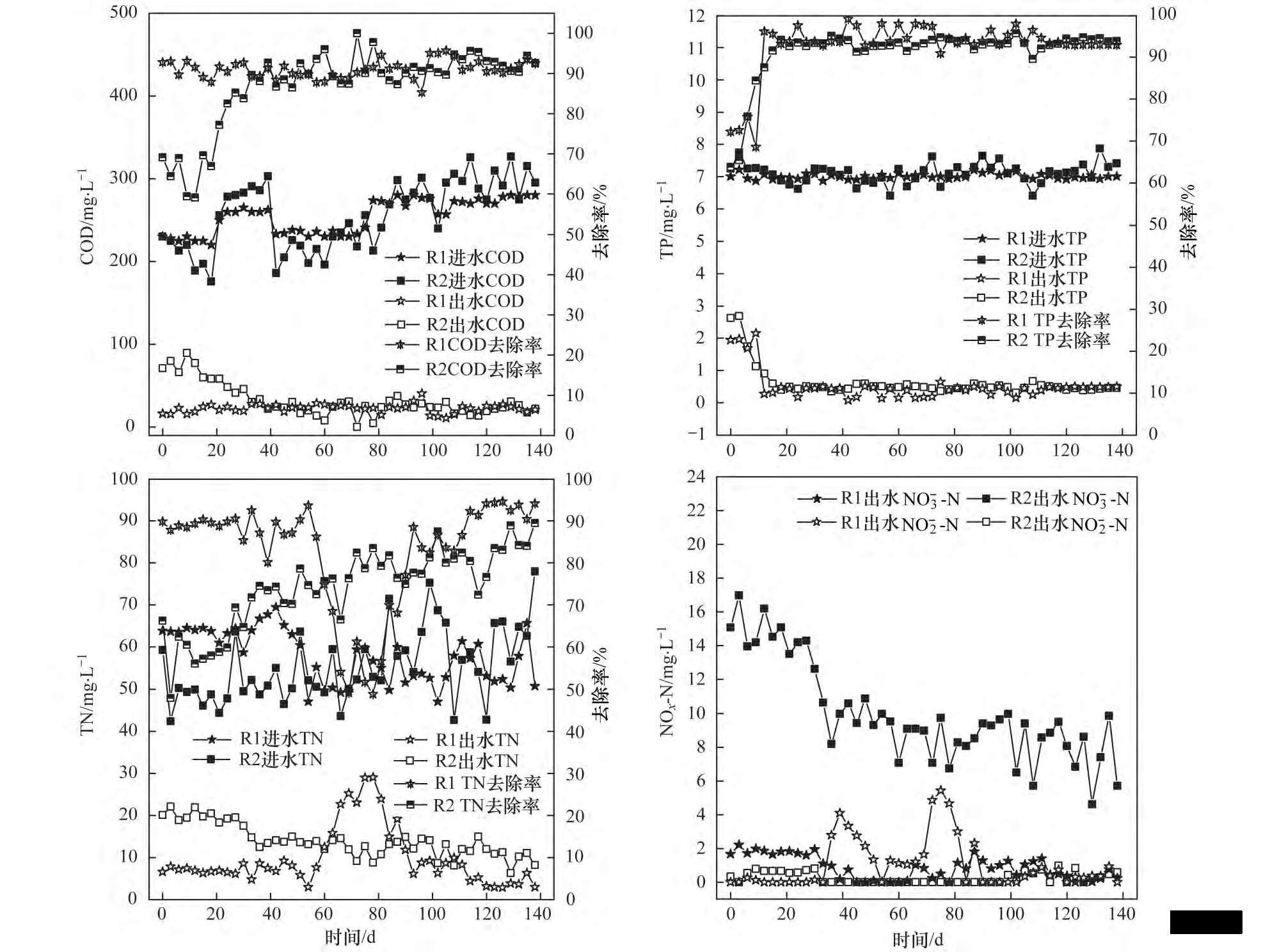 圖 5 R1 和 R2 反應器去除 COD、TP、TN 和 NO - -N 的性能