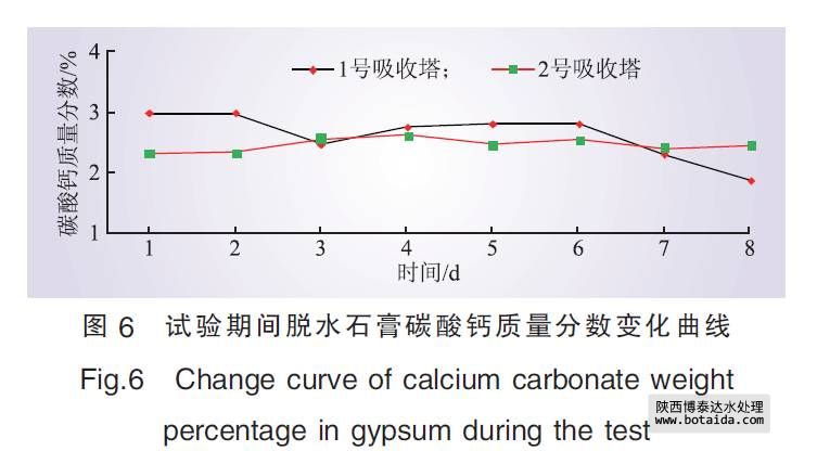 由圖3—7可以看出, 試驗期間, 雖然混入處理后的工業廢水量不斷加大, 但脫硫系統漿液密度均能維持在1 130 kg/m3左右, 且脫硫效率仍然大于或等于95%; 脫硫副產品石膏品質未發生明顯變化, 石膏的含水率基本保持在10%, 石膏中CaCO3質量分數小于3%, CaSO4· 2H2O純度大于90%, 符合商用石膏品質要求。此外, 試驗期間除霧器壓差處于正常運行范圍之內, 吸收塔沒有發生起泡、堵塞等不正常現象。試驗結果表明, 處理后的工業廢水可用作脫硫工藝水。