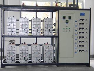 現今市場上大多數的EDI模塊產品由交替放置的陽離子膜和陰離子膜構成,水從其中的膜隙流過。這些交替放置的陰、陽離子交換膜被固定在兩個帶有進出水口的裝置之間,水從其中的膜間隙流過。面向正極的陰離子膜與面向負極的陽離子膜之間構成濃水室,面向負極的陰離子膜與面向正極的陽離子膜之間組成淡水室。為了便于在弱電解質溶液中強化離子交換過程,在淡水室,有時在濃水室添加離子交換樹脂。在 EDI模塊裝置機架兩端的電極提供了橫向的直流電場,直流電場驅動水中的離子運動穿過離子交換膜。從而實現淡水室中的離子濃度降低和濃水室的離子