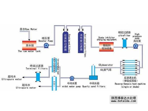 炭濾與軟化的工藝位置砂濾或超濾工藝對懸浮物、膠體與大粒徑有活性炭濾工藝存在吸附有機物及還原氧化劑的雙重功效。在吸附有機物方面,活性炭既可以其巨大的深孔內表面積吸附小粒徑有機物,又可以其有限的顆粒表面積吸附膠體與大粒徑有機物。由于膠體與大粒徑有機物在活性炭表面的附著將阻塞小粒徑有機物進入深孔的通路,活性炭工藝更適合于對小粒徑有機物的吸附。而混凝機物的截留起到了對活性炭的保護作用。砂濾或超濾工藝之后,在樹脂軟化工藝之前。活性炭對小粒徑有機物的去除作用,不僅可以保護反滲透膜免于有機物污染,還可有效保護軟化用樹脂不被有機物污染。因此活性炭工藝在預處理工藝流程中的位置一般在混凝氧化劑在反滲透系統中扮演著雙重角色,它既對反滲透膜及軟化樹脂形成氧化降解作用,又對預處理各工藝及管線中的微生物污染具有抑制作用。活性炭工藝還原氧化劑之后,系統流程各后續工藝將不受氧化劑保護,當系統原水溫度較高或微生物含量較高時,后續的交換樹脂將受微生物的威脅。因此,對于微生物含量較高、原水溫度較高、氧化劑含量較低的情況,活性炭濾工藝應置于離子交換工藝之后;對于微生物含量較低、原水溫度較低、氧化劑含量較高的情況,活性炭濾工藝應置于離子交換工藝之前。