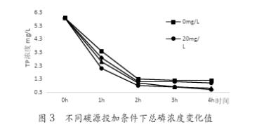 如圖3表示,葡萄糖作為外加碳源,在投加量分別為0、20mg/L、40mg/L和80mg/L情況下,總磷隨時間的變化值。總磷隨反應時間的延長,濃度逐漸降低,最終出水濃度分別為1.2mg/L、1.0mg/L、0.6mg/L和0.5mg/L。在投加碳源后,系統對除磷的效果有所提升,對總磷的去除率分別為80%、83%、90%和92%。投加碳源達到20mg/L后,出水均滿足一級B標準,而且隨著投加量的增加,系統對總磷的處理效果增強。