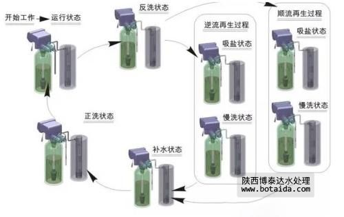 由于實際工作的需要, 軟化水設備的標準工作流程主要包括:工作(有時叫做產水)→反洗→吸鹽(再生)→慢沖洗(置換)→快沖洗五個過程。不同軟化水設備的所有工序非常接近,只是由于實際工藝的不同或控制的需要,可能會有一些附加的流程。任何以鈉離子交換為基礎的軟化水設備都是在這五個流程的基礎上發展來的(其中,全自動軟化水設備會增加鹽水重注過程)。